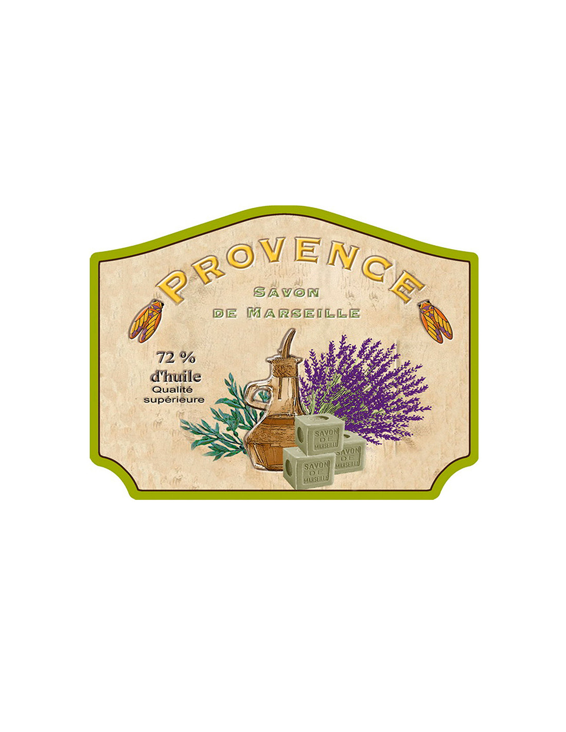 La paraula PROVENCE, escrita en grans lletres grogues, és el centre d'atenció, ressaltant sobre un fons suau. Just a sota, la frase "Savon de Marseille" en lletres verdes evoca l'autenticitat dels tradicionals sabons artesanals de la zona, un producte icònic de la cultura provençal. Al costat d'aquesta inscripció, els dibuixos detallats d'uns sabons, un ram de flors d'espígol i unes branques d'olivera porten la frescor i l'aroma de la natura mediterrània, omplint de vida i color la decoració.