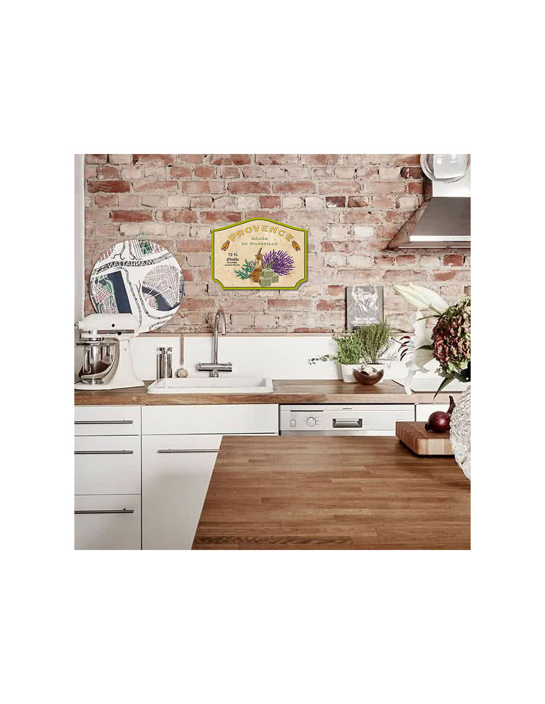 La Placa metall per a paret PROVENCE és una peça decorativa que ens transporta directament als paisatges assolellats i aromàtics de la Provença francesa. Inspirada en la simplicitat i la bellesa de la vida campestre, aquesta placa combina elements visuals que reflecteixen el millor d'aquesta regió, com el famós sabó de Marsella, l'espígol i l'oli d'oliva. Amb un disseny en tons beix i verds, el seu estil vintage li dóna un aspecte envellit que afegeix caràcter a qualsevol espai, ja sigui a la cuina o al bany.