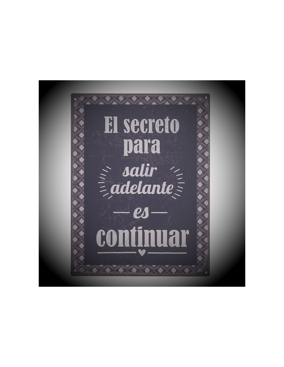 La Placa paret frase EL SECRET és una peça decorativa que ens recorda el valor de la perseverança. Amb la frase "El secret per tirar endavant és continuar", escrita en lletres blanques sobre un fons fosc, aquesta placa es converteix en un recordatori visual que la clau de l'èxit és no rendir-se. L'aspecte rovellat i la sanefa en tons grisos i blancs desgastats li atorguen un toc vintage i ple de caràcter. És ideal per decorar espais on la motivació i l'energia positiva siguin benvingudes, com ara oficines, estudis o salons.
