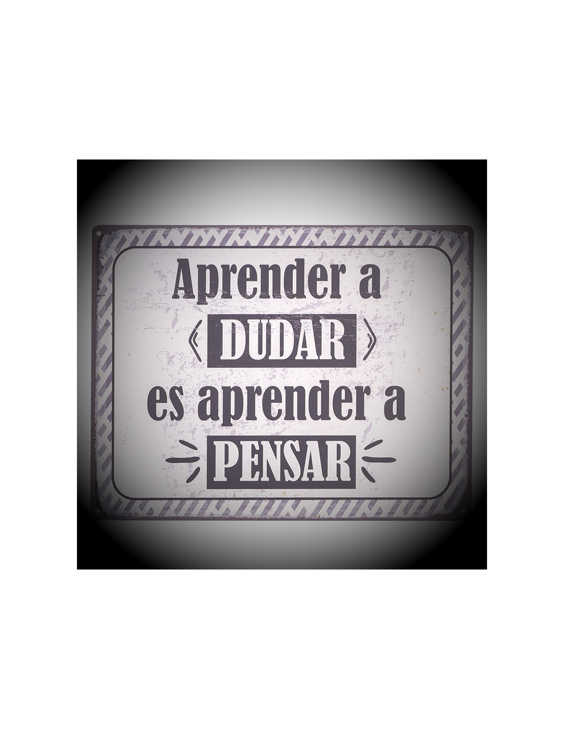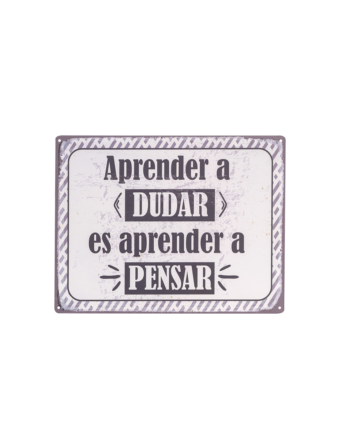 És una peça decorativa dissenyada per als que valoren el poder de la reflexió. Amb la frase “Aprendre a dubtar és aprendre a pensar”, convida a qüestionar i analitzar el món que ens envolta, recordant-nos la importància de mantenir la ment oberta. Feta de metall amb un acabat envellit que simula òxid, aquesta placa aporta un toc de saviesa i caràcter a qualsevol espai. El seu estil rústic, amb vores lleugerament desgastats, la converteix en un element decoratiu que destaca tant per la seva estètica com pel missatge.