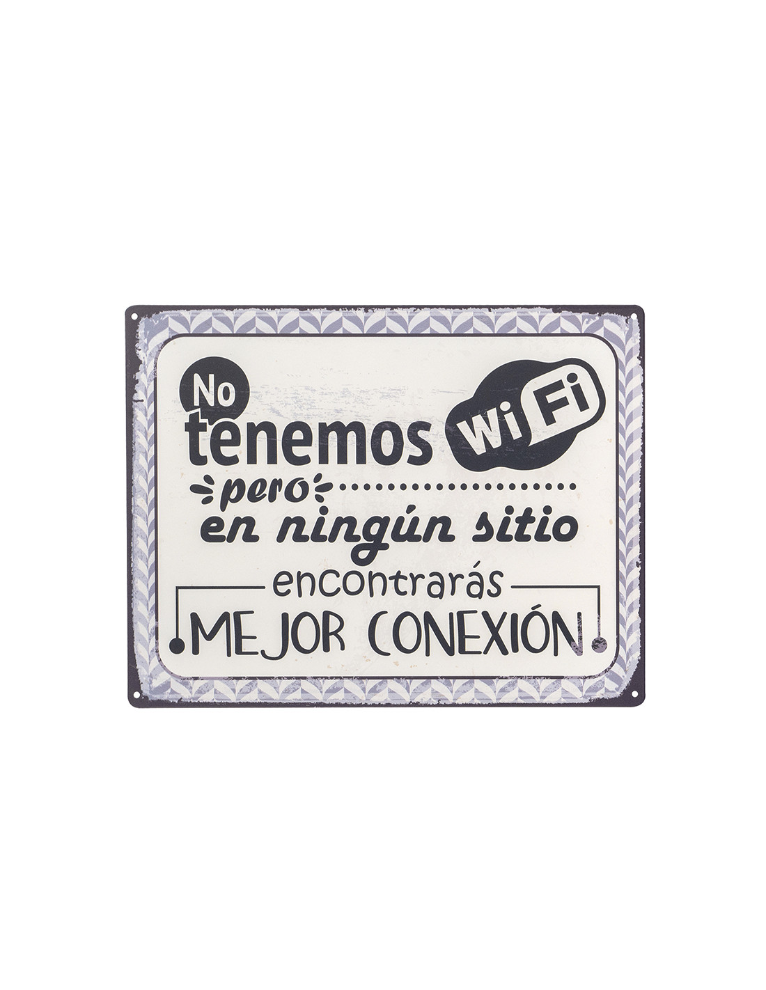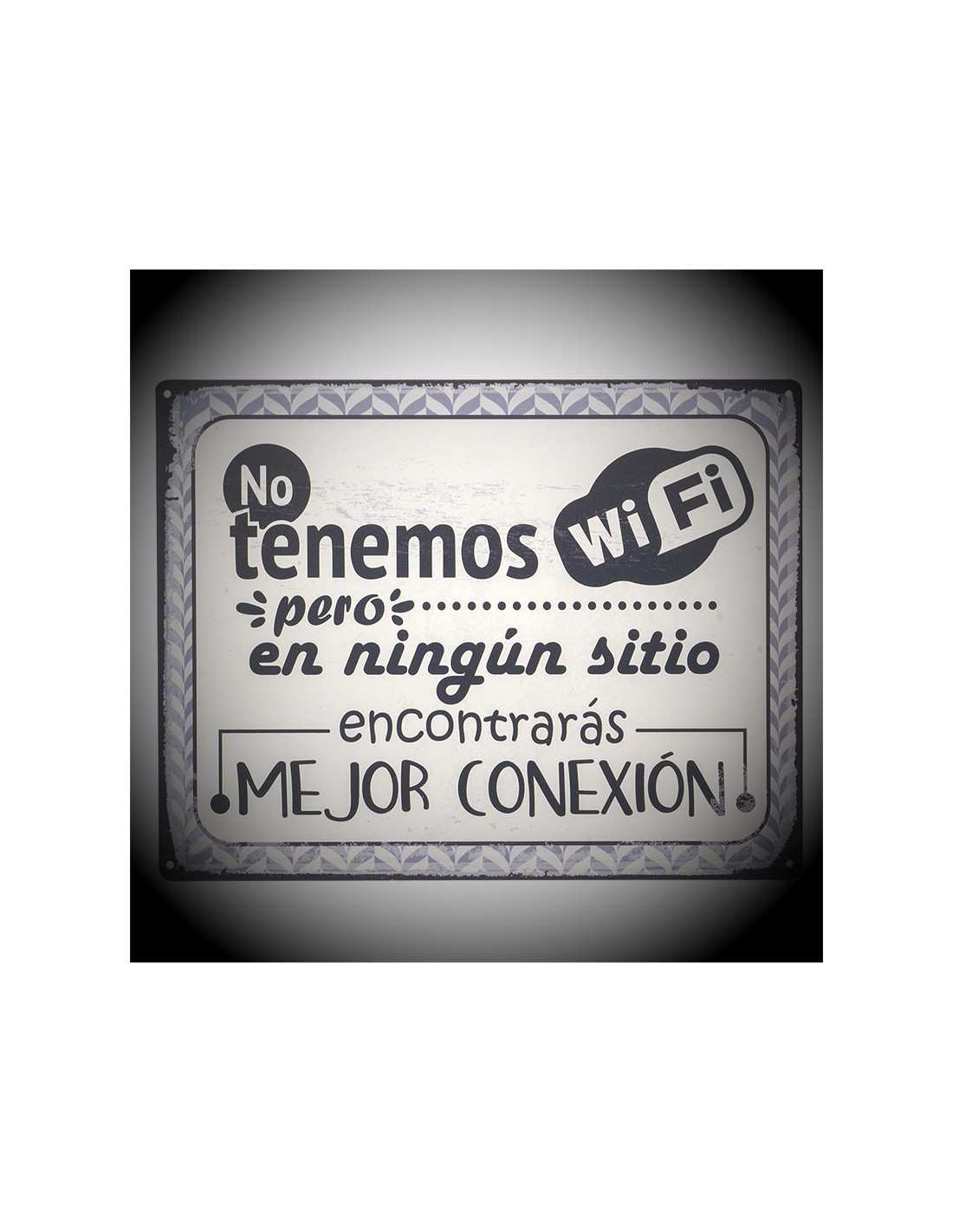 La Placa de paret frase NO TENIM WIFI de SINUSUAL és una peça decorativa que convida a desconnectar del món digital per connectar-se amb allò que realment importa. Amb un aspecte envellit que simula el metall rovellat, aquesta placa transmet un missatge clar: "No tenim wifi, però enlloc no trobaràs millor connexió". La combinació de diferents estils tipogràfics sobre un fons clar, juntament amb una subtil sanefa de fulles desgastades, li dóna un toc rústic i alhora acollidor. És perfecta per afegir humor i calidesa a qualsevol racó de la llar, oficina o cafeteria
