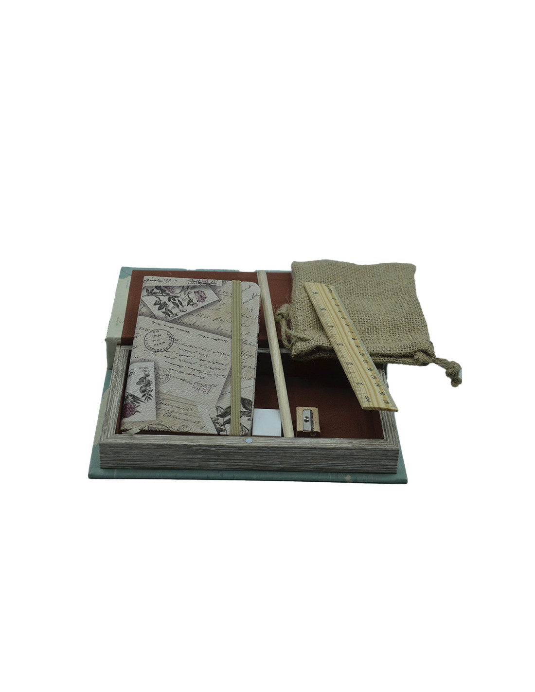 El company perfecte per a les petites aventures de cada dia. Aquesta caixa llibre amb mapamundi guarda sis objectes essencials per a qui troba allò extraordinari en allò proper. Per a viatges sense maleta però amb l'ànima preparada. Mides: 21x5x12,5 cm.