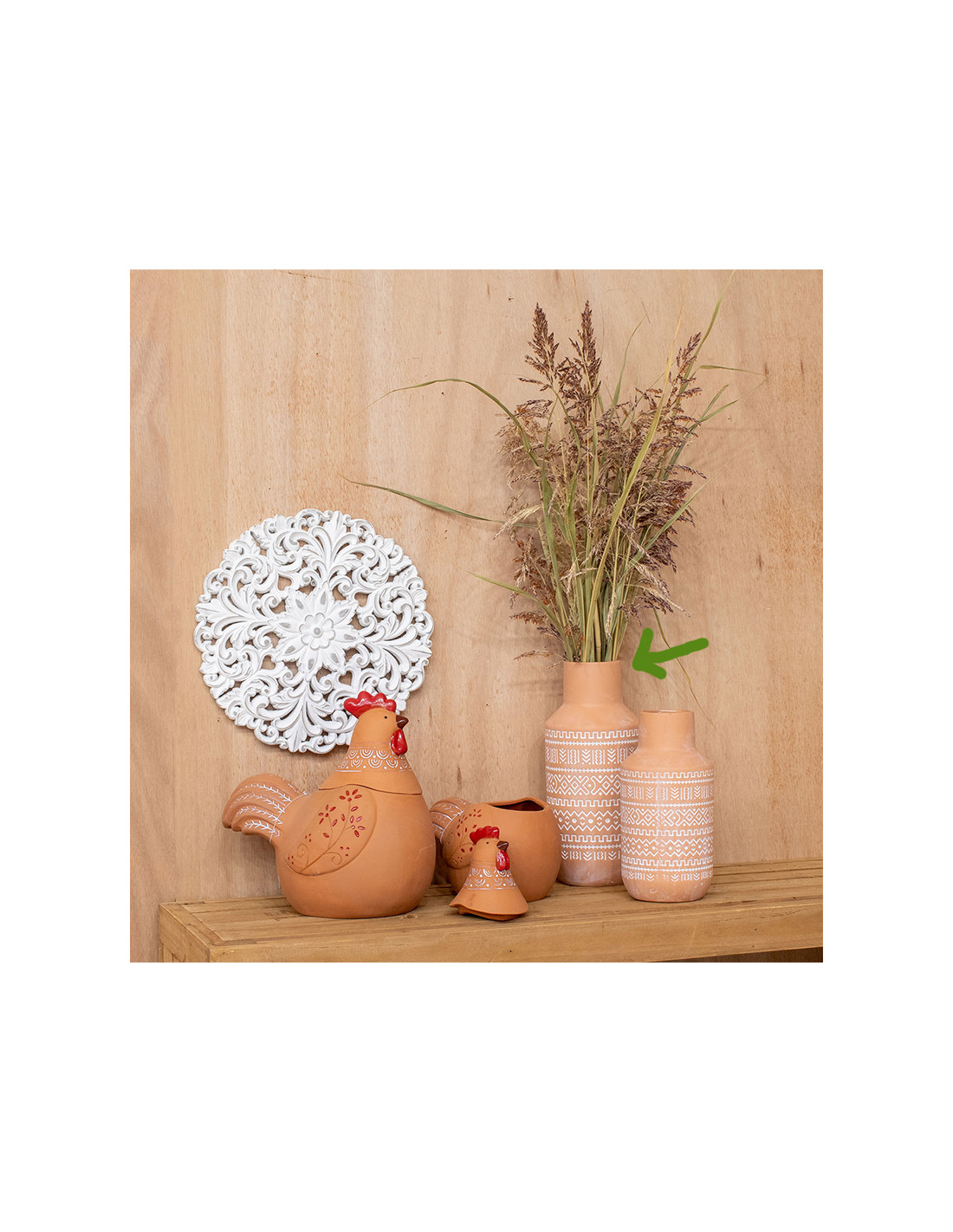 Aquest gerro de ceràmica, amb un disseny encantador de dues nanses, és una obra d'art pintada amb una paleta de quatre colors captivadors. No només és un recipient, sinó una expressió d'elegància que afegeix un toc distintiu i original al teu espai.