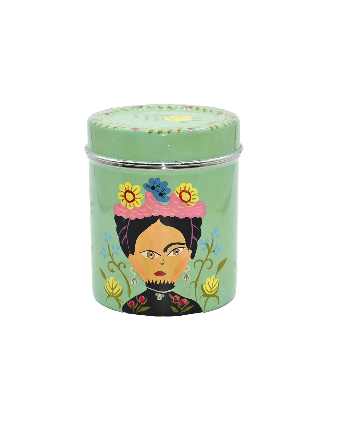 Aquesta caixa dʻacer inoxidable esmaltat fusiona art i utilitat. Pintada a mà amb dissenys que rendeixen homenatge a Frida Kahlo, és ideal per guardar-hi petits tresors, els teus tes o galetes preferides.