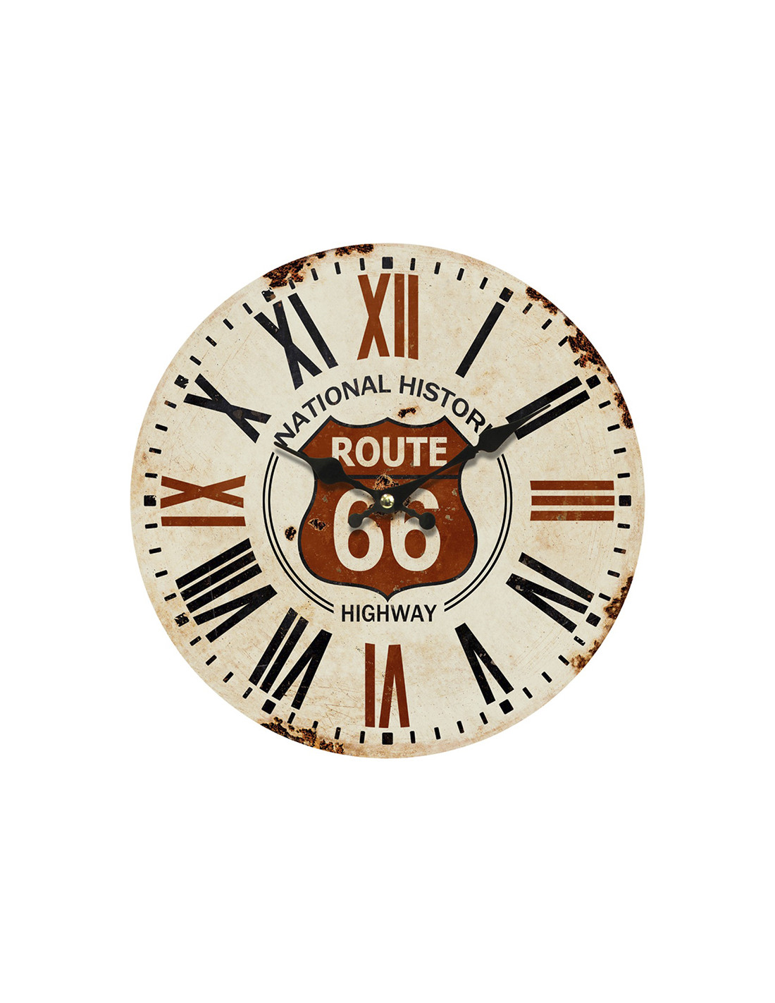 El Rellotge de paret vintage ROUTE 66 és ideal per als que busquen afegir un toc retro i ple de caràcter a casa seva. Amb un diàmetre de 34 cm i un acabat que imita el ferro rovellat, aquest rellotge evoca l'essència de la famosa carretera americana Route 66, convertint-se en un element visualment impactant. El disseny amb numeració romana i el seu aspecte envellit el fan perfecte per a espais amb una temàtica vintage o industrial.