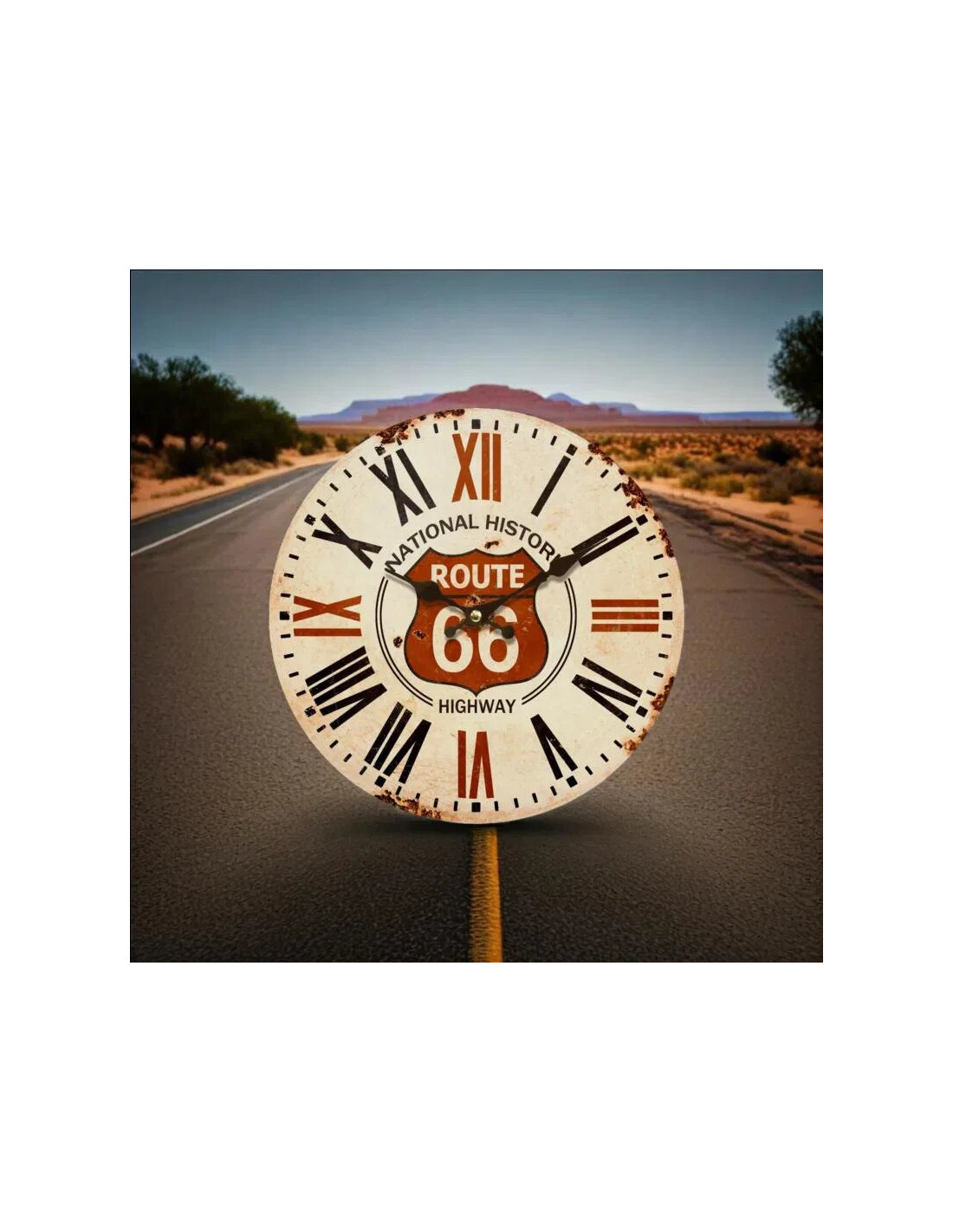 Transforma qualsevol habitació en un espai ple d´història i personalitat. Amb un disseny inspirat en la famosa carretera nord-americana, aquest rellotge rememora l'esperit de llibertat i aventura de la Ruta 66. El seu aspecte envellit, que simula un ferro rovellat, li atorga un aire autèntic i rústic, ideal per als que volen donar-li un toc vintage a casa seva.