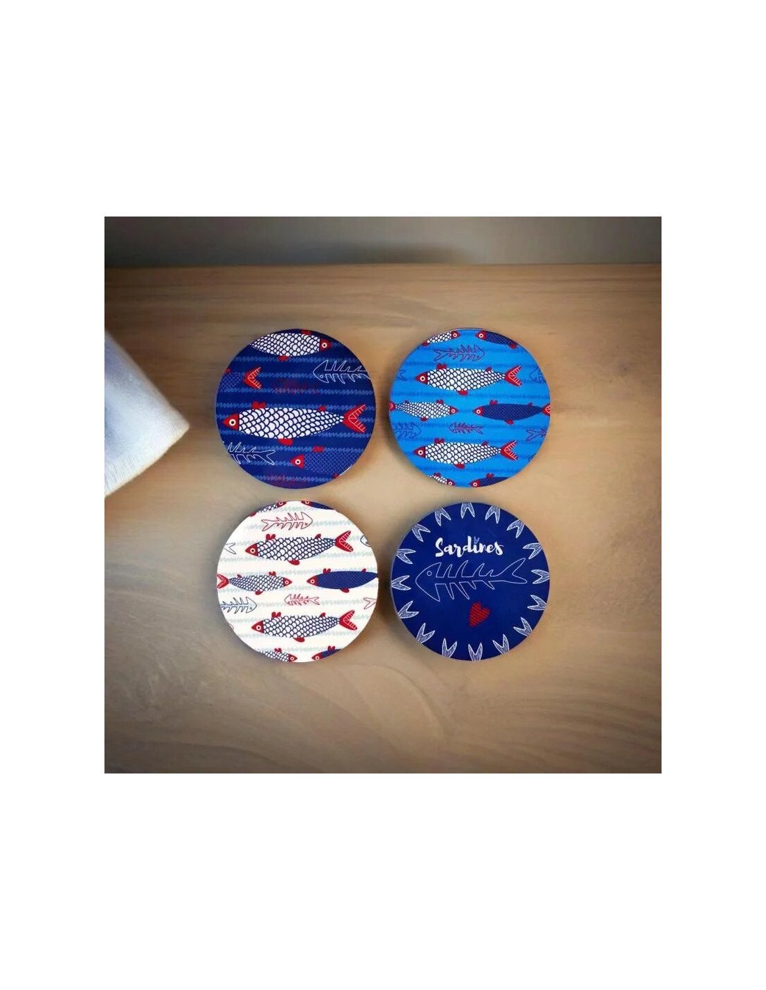 El set inclou quatre peces decorades amb peixos amb tons blaus. Amb un diàmetre de 20 cm cadascun, aquests salvamantells són tant funcionals com estètics, protegint les teves superfícies mentre afegeixen un toc marítim.