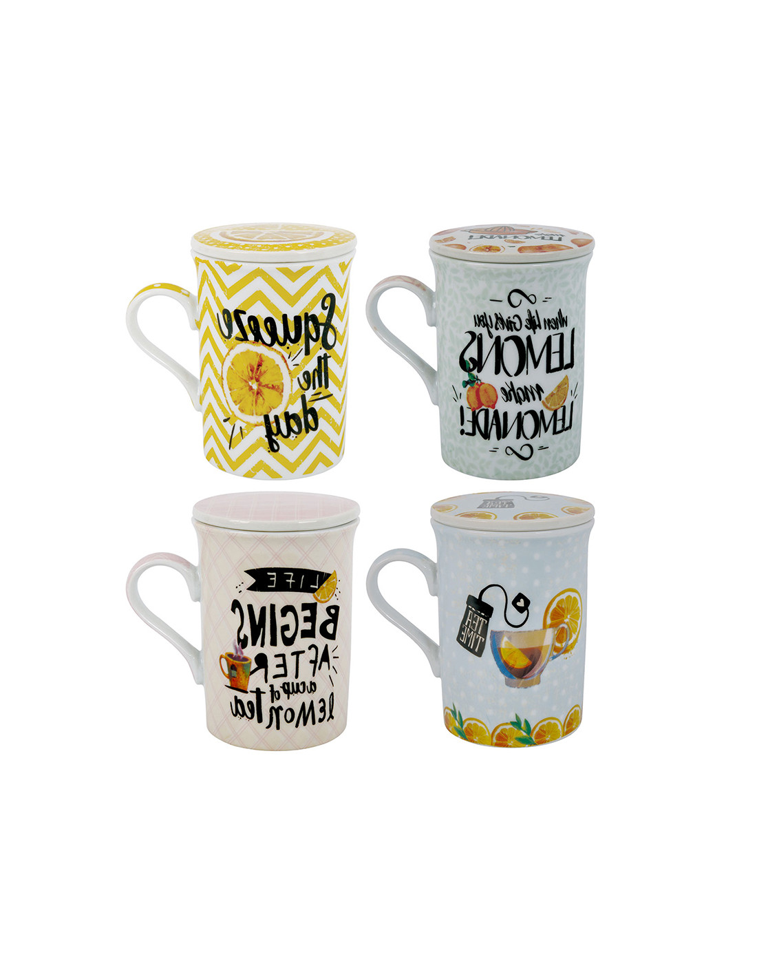El joc de 4 mugs amb tapa i filtre combina el disseny amb una experiència de te ideal. Cada mug de ceràmica compta amb una tapa que conserva la calor i un filtre d?acer inoxidable perfecte per a infusions fresques. Decorats amb frases i motius inspirats en la llimona i el te, aquest set afegeix un toc de joia i personalitat a qualsevol moment.