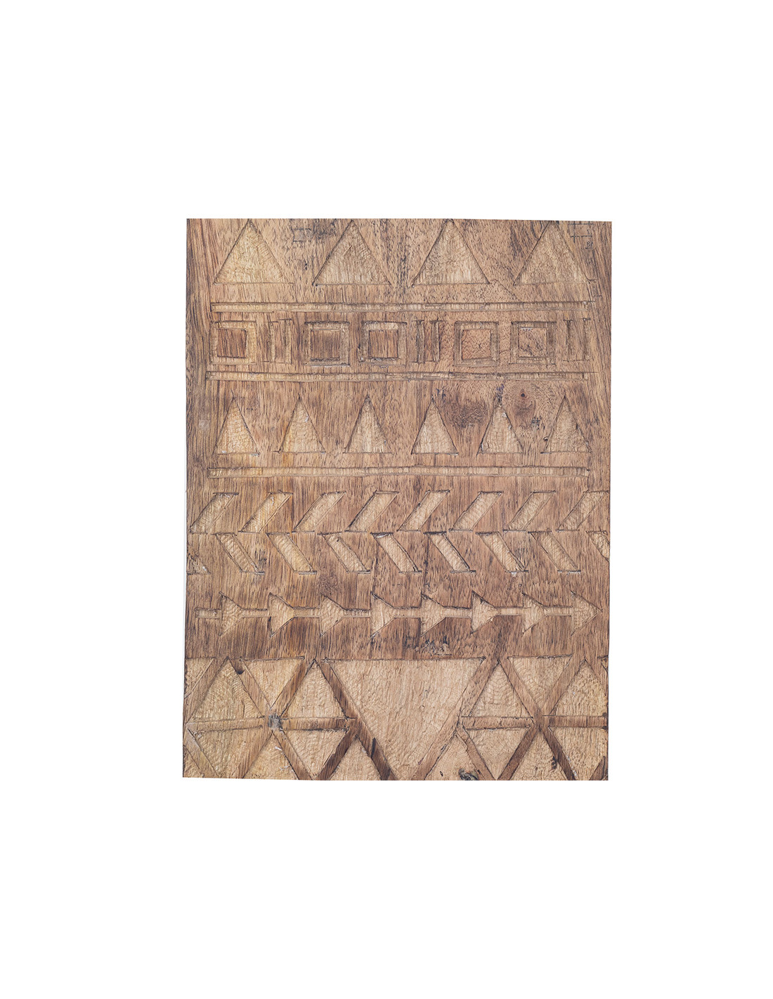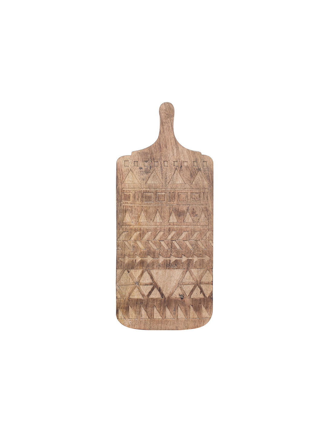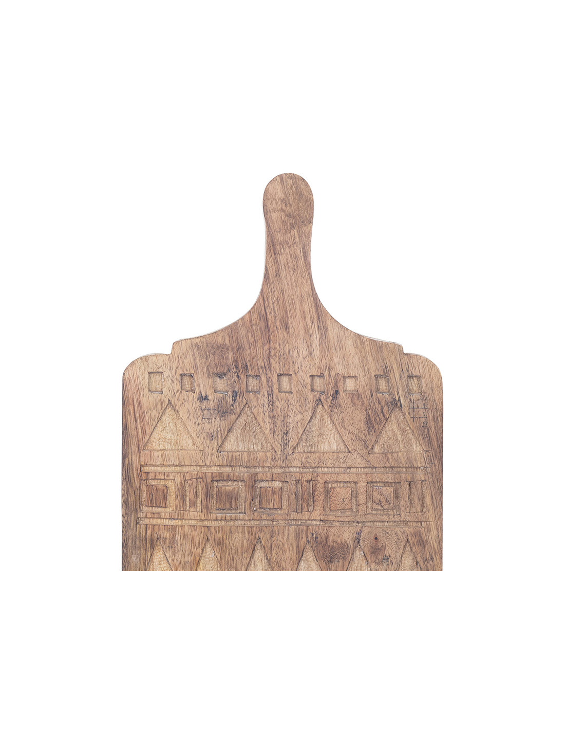 Amb dimensions ideals per fer servir una varietat d'aliments, aquesta taula de tallar és pràctica i versàtil. La seva superfície llisa permet un tall precís i segur, mentre que la suavitat de la fusta ajuda a mantenir el tall dels ganivets en bon estat. Els dibuixos geomètrics, a més de decoratius, ofereixen un relleu subtil que facilita el maneig d'aliments més petits o relliscosos, afegint-hi un valor funcional al disseny.