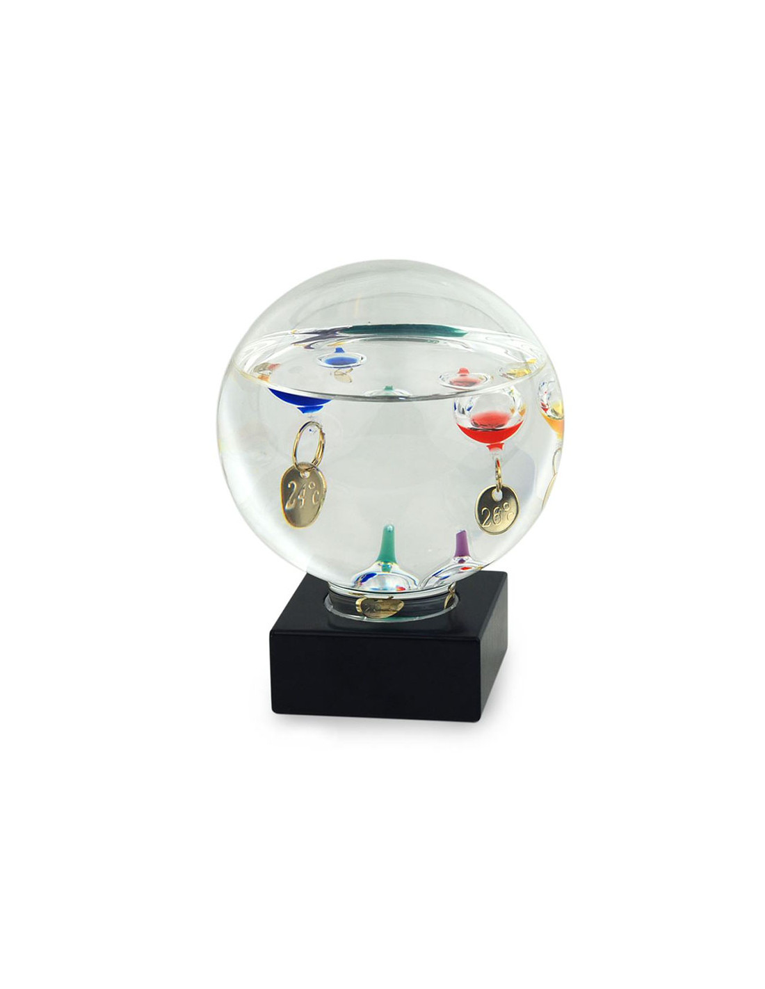 Termòmetre Galileu de vidre reutilitzable que funciona com petjapapers. Inclou 5 esferes flotants calibrades (26º a 18º). Pes: 420 g. Mides: 10x10x12 cm. Una peça científica i decorativa pel teu espai de treball o estudi.