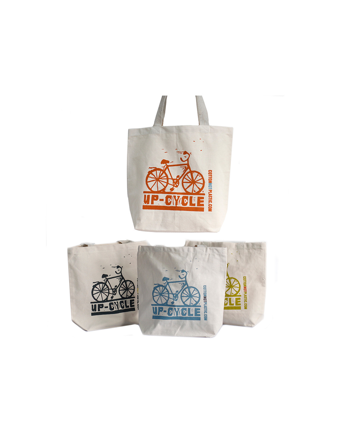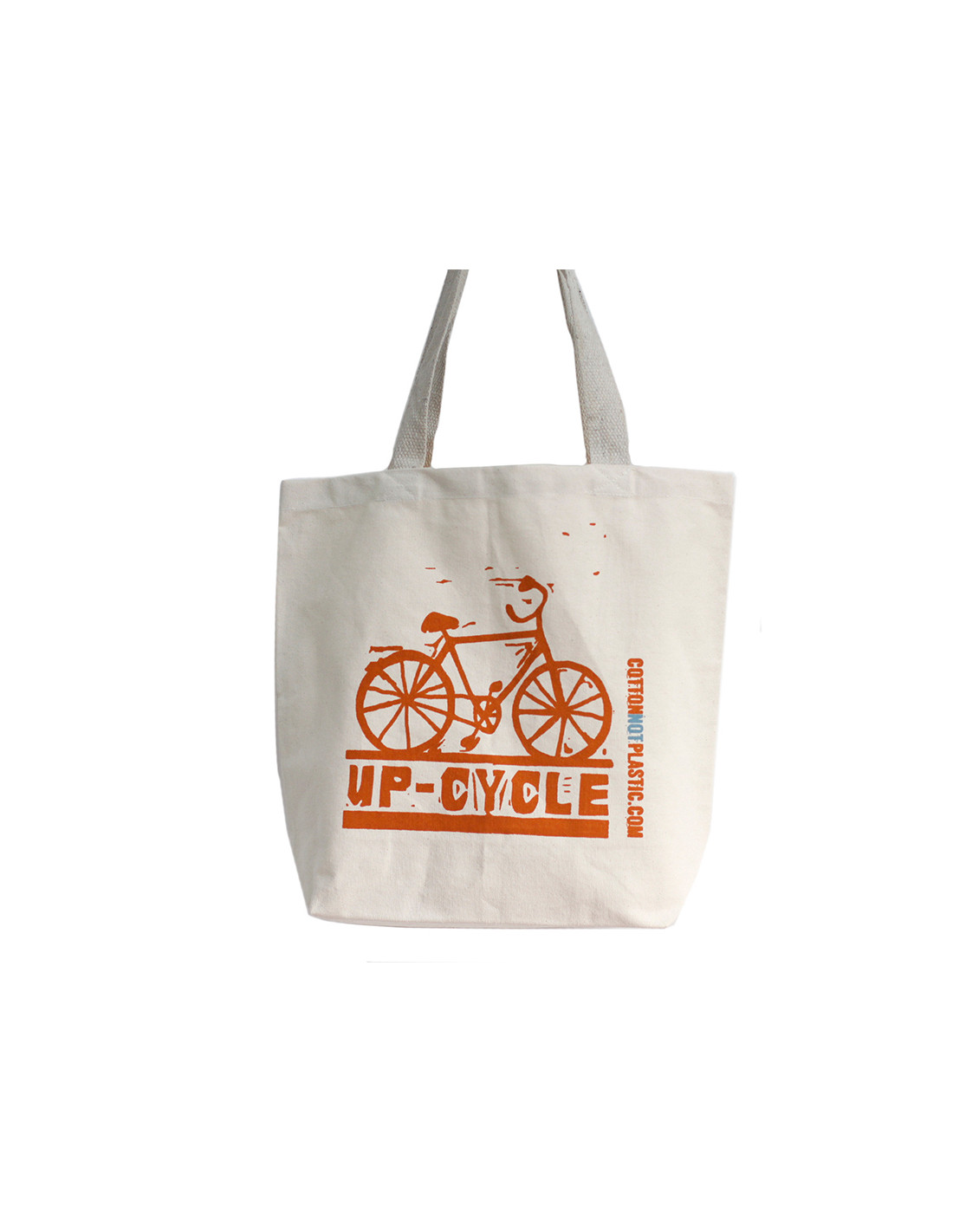 Confeccionada en algodón orgánico de cultivo sostenible, esta bolsa reduce el uso de plásticos en tu día a día. Su diseño incluye un alegre estampado de bicicleta, disponible en cuatro colores.