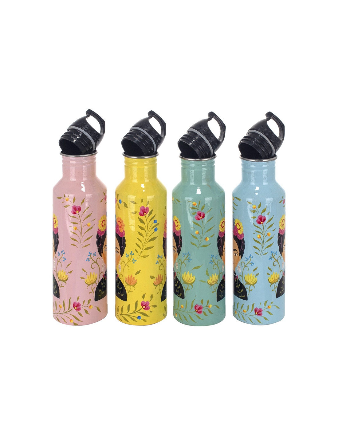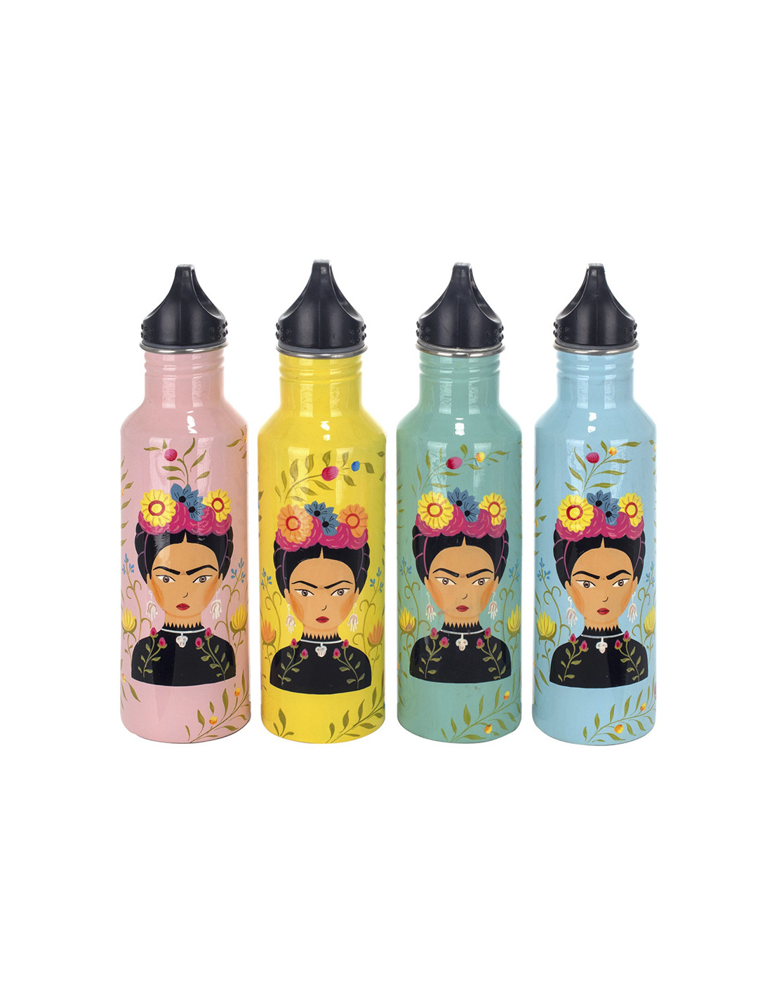 Botella de acero inoxidable esmaltado, pintada a mano con motivos inspirados en Frida Kahlo. Capacidad: 900 ml. Disponible en cuatro tonos llenos de vida: azul, verde, amarillo y rosa. Cada pieza es única, con ligeras variaciones en su diseño artesanal.