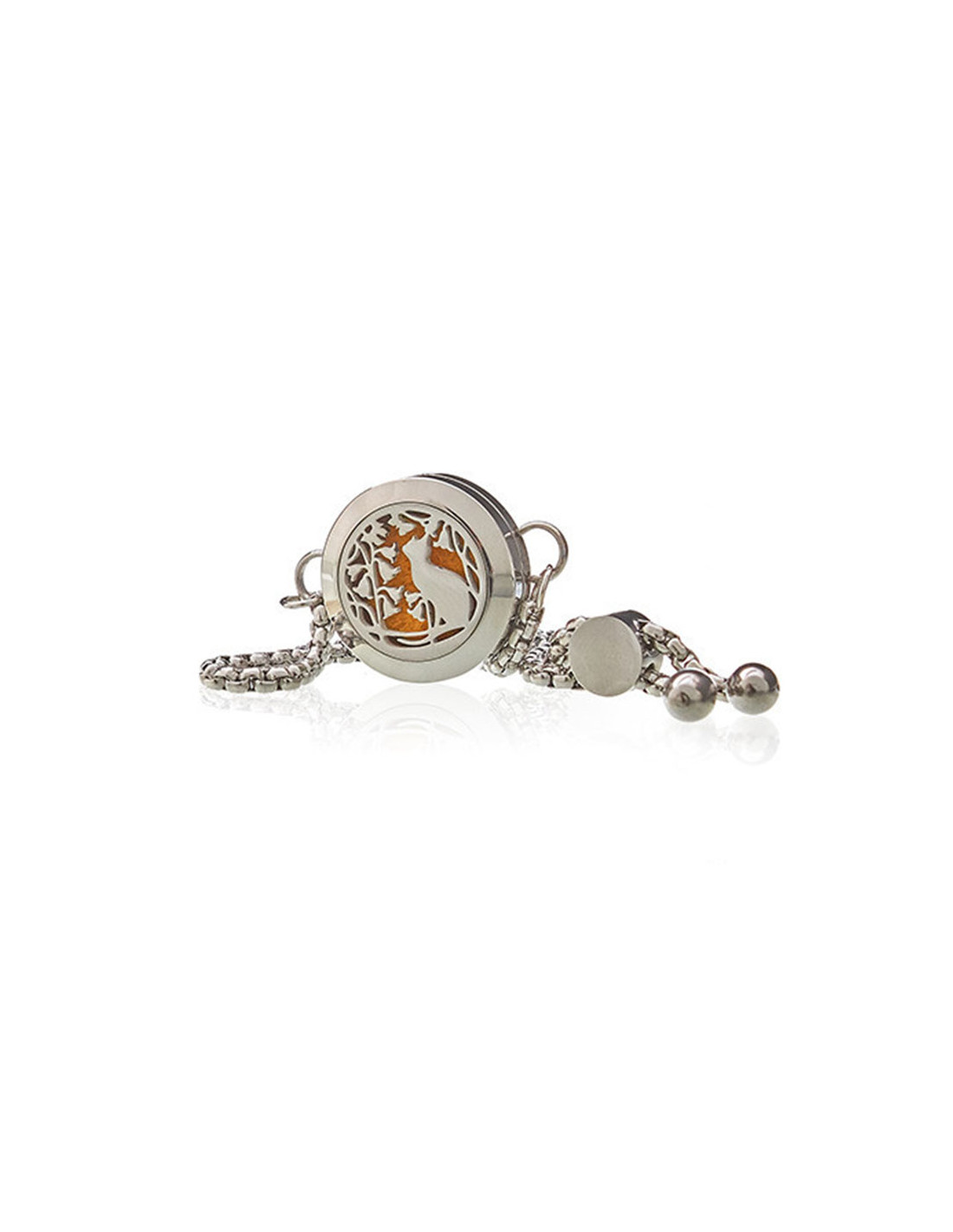 Esta pulsera combina funcionalidad y diseño con un delicado motivo de un gato rodeado de flores. Está fabricada en acero inoxidable y se acompaña de diez almohadillas reutilizables, que permite disfrutar de los beneficios de los aceites esenciales en cualquier momento del día. Un accesorio práctico y elegante que destaca por su originalidad.