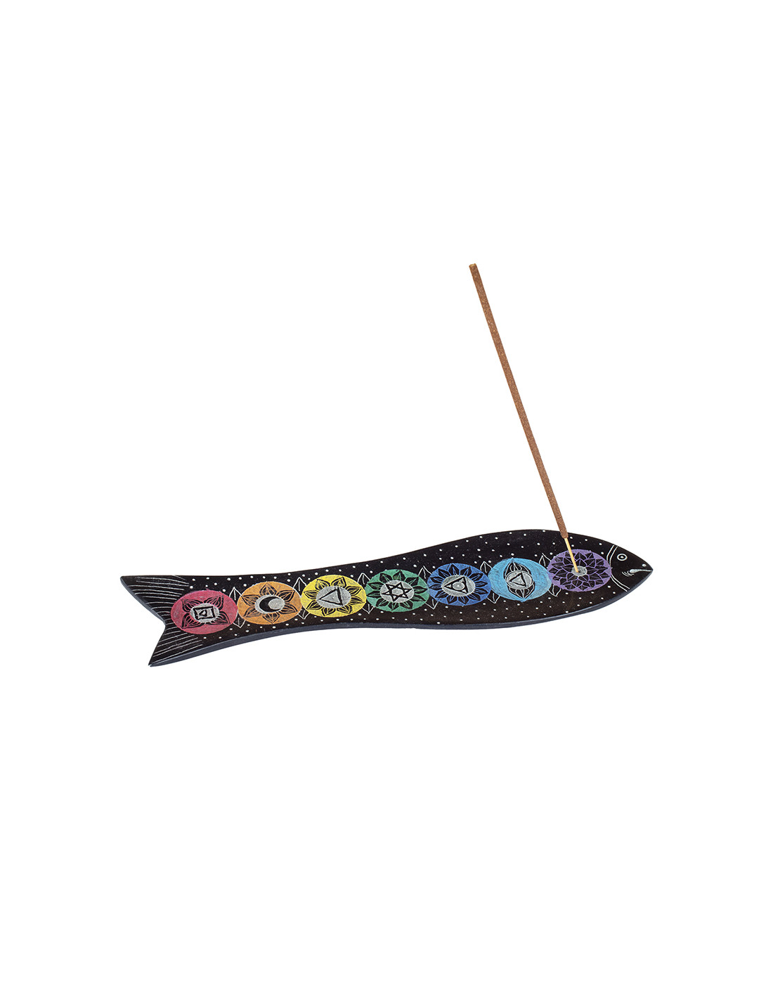 Con forma de pez, está elaborado en piedra de jabón negra y decorado con símbolos de los chakras en distintos colores.